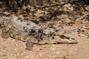 | Am Nachmittag besuchte ich die nahe gelegene Krokodilfarm. Nebst kleinen, einjährigen Jungtieren in Terrarien, waren da auch riesige, bestimmt 6-7 m lange Tiere da. Der Guide gab deren Alter mit 70, 80 und mehr Jahren an. Mit einem Stock störte er sie und da war deutlich erkennbar, mit welcher Geschwindigkeit sie den Kopf drehen und das Maul aufreissen. Wirklich furchterregend… da möchte ich nicht zwischen die Kiefer geraten!!! |