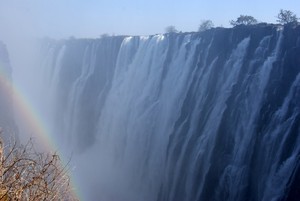 | | Imposant das Getöse und die Unmengen Wasser, die sich da in die Tiefe stürzten. In der Gischt und dem sich bildenden Nebel war der Grund der Schlucht praktisch nicht zu erkennen. Der Sambesi stürzte sich einfach ins Nichts! Alles nass und feucht. Gut, hatte ich den Regenschutz dabei! Viktoriafälle – ein gewaltiges Schauspiel! Der, bzw. die sich bildenden Regenbogen rundeten das ganze Spektakel eindrücklich ab! |